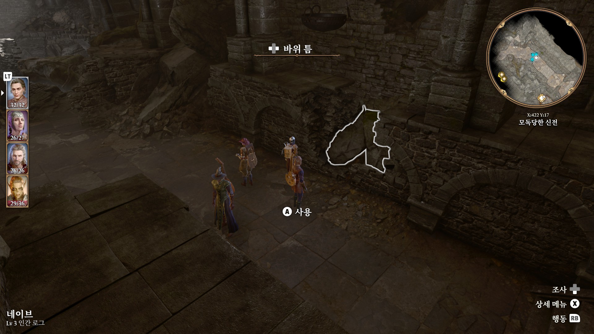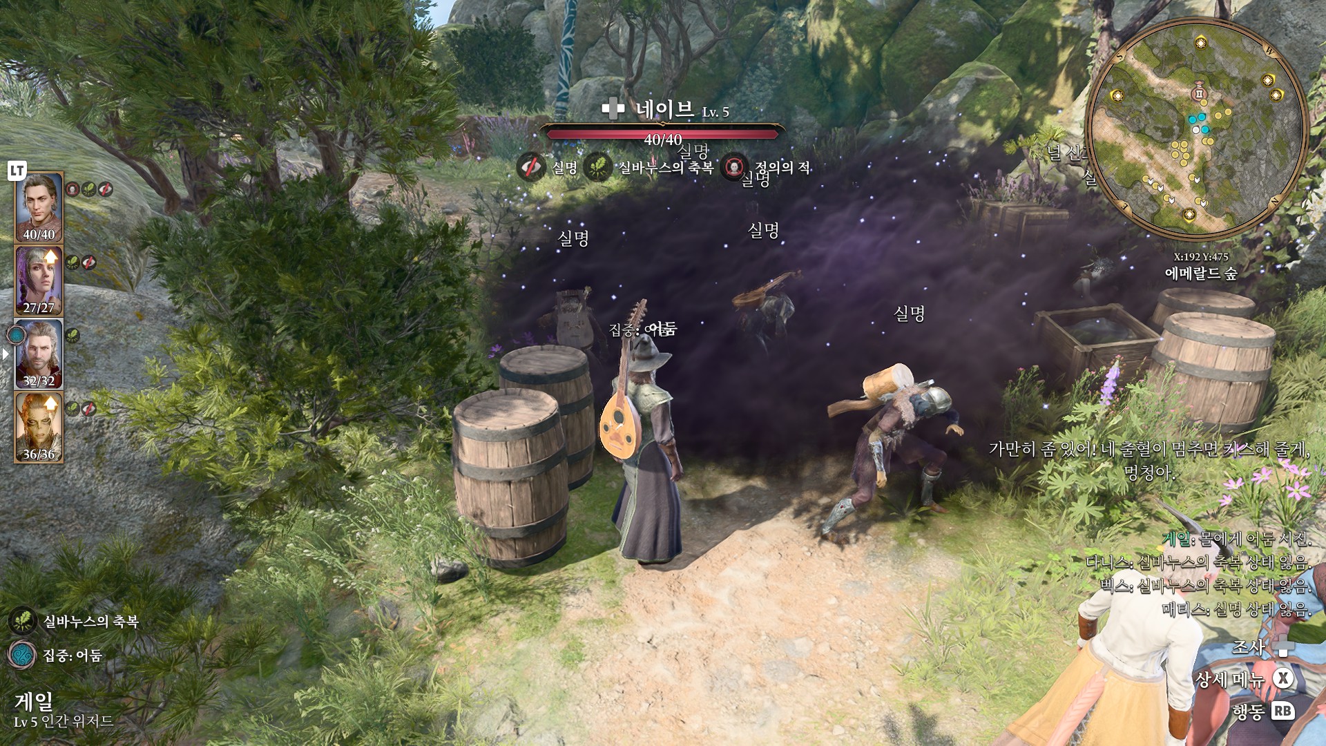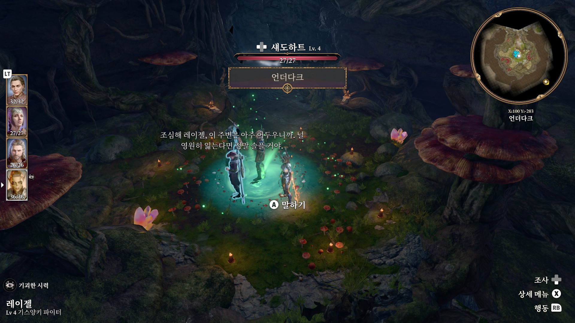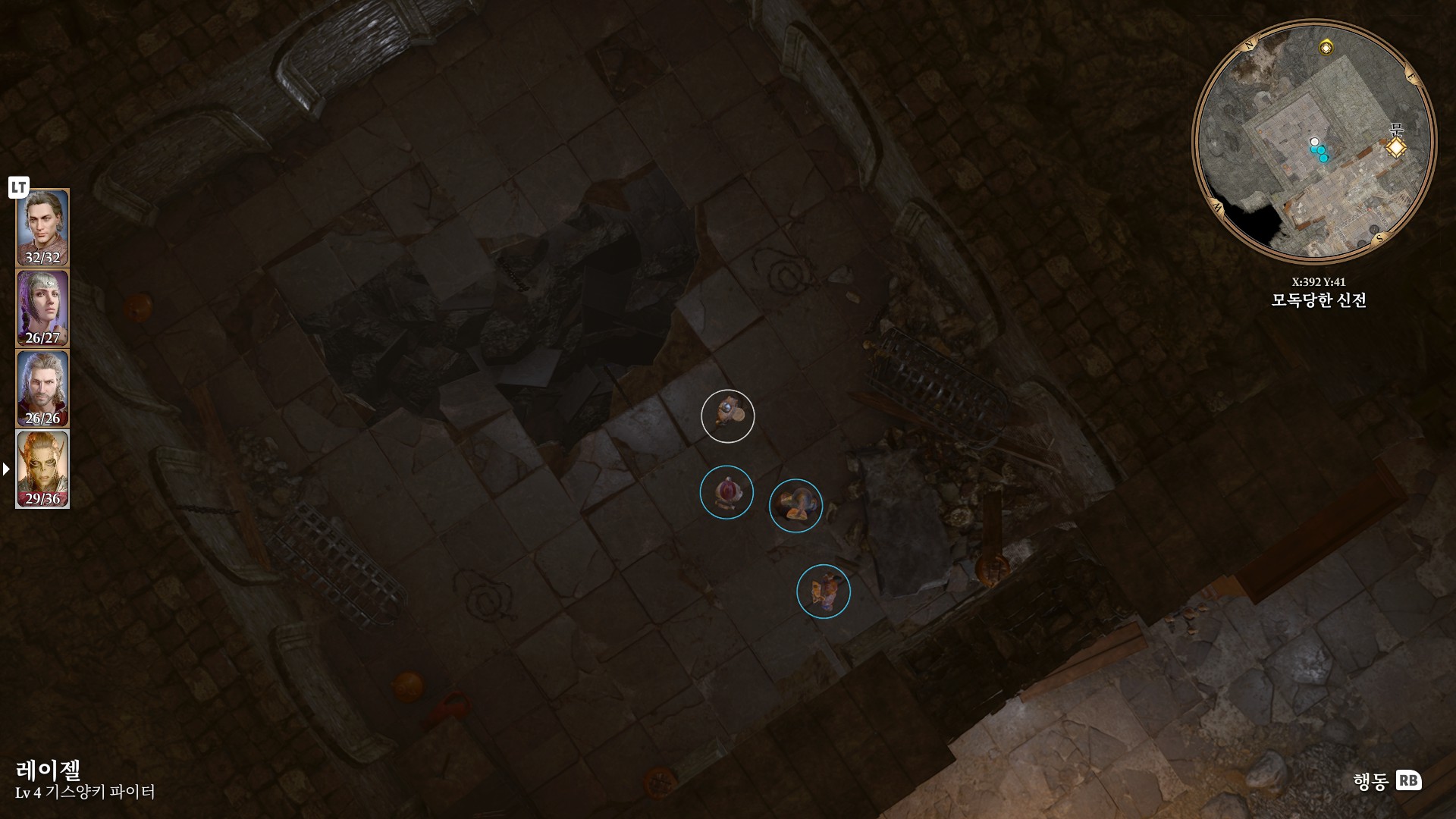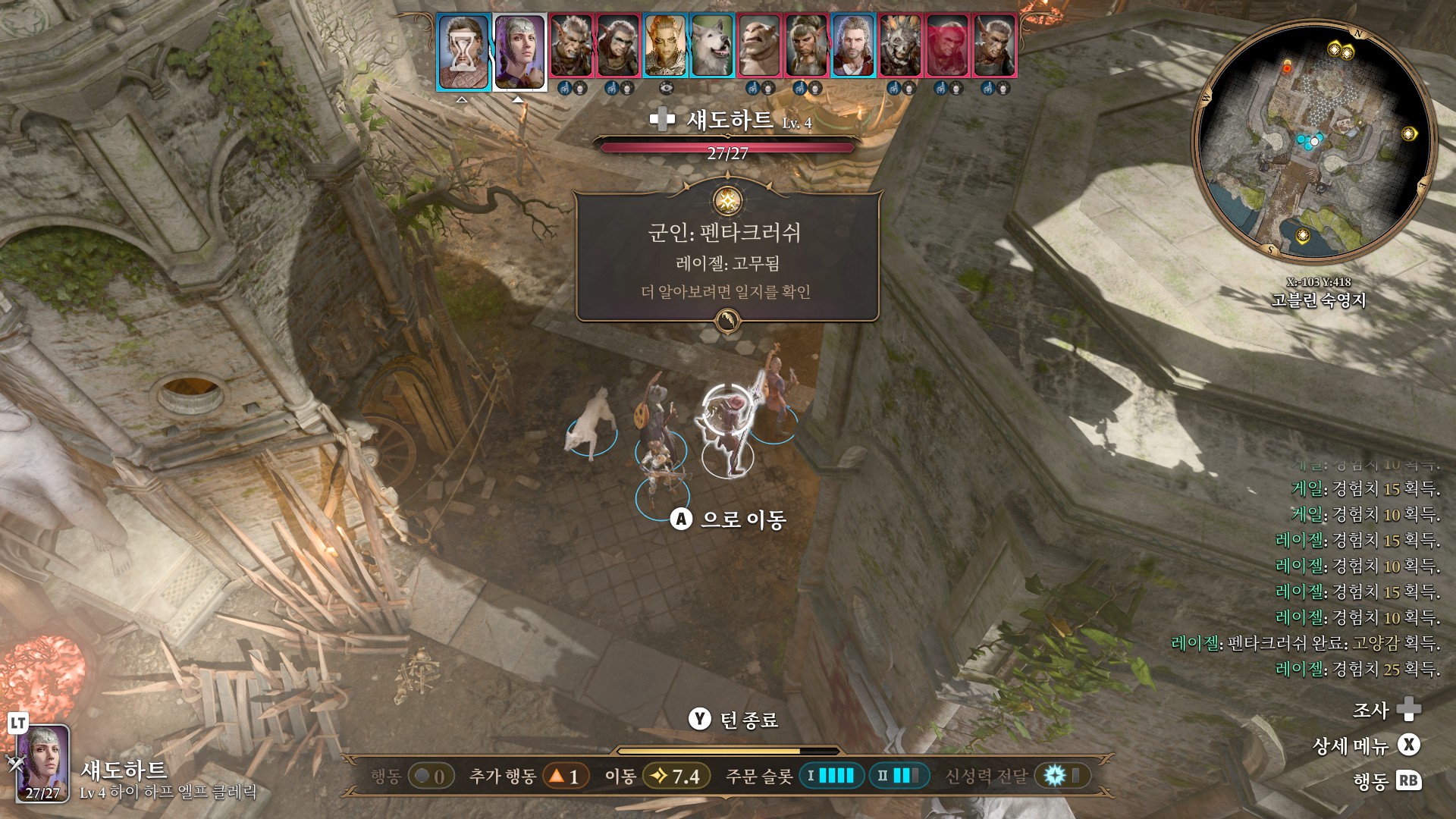 1. 게일을 파티에서 분리 단독 행동 (LT 누르고 Y 로 단독으로 분리)