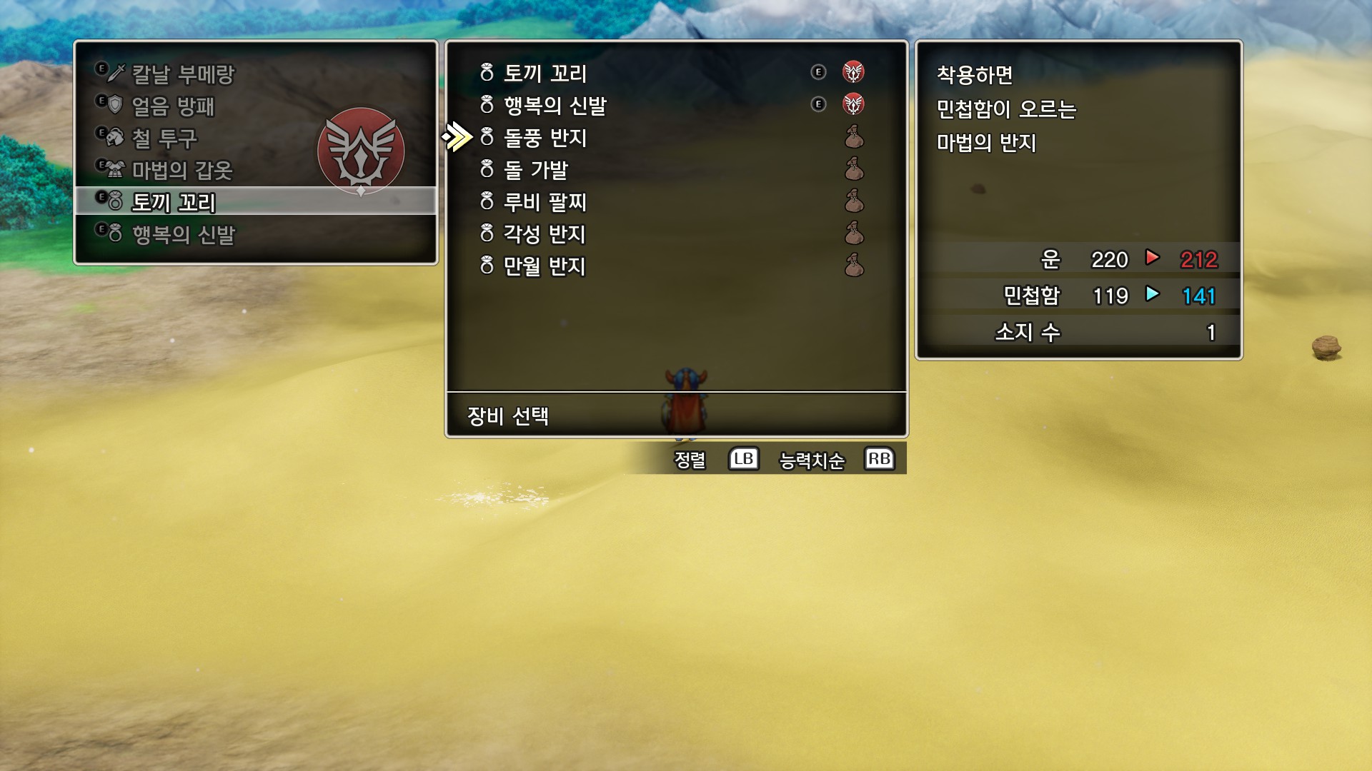 주머니로 옮기고 악세서리도 로토의 증표랑 화염 대